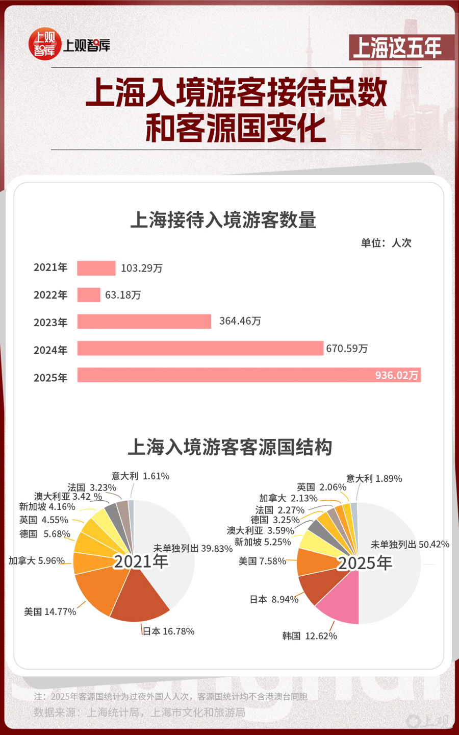 開放的上海,在全球的魅力日益提升。乘著免簽政策東風(fēng),上海在入境游賽道走出強(qiáng)勁上升曲線,“中國(guó)入境游第一站”吸引力持續(xù)攀升。去年全年,上海接待入境游客總量936.02萬人次,創(chuàng)下歷史新高,成為全球游客感知中國(guó)文化、體驗(yàn)都市魅力的首選目的地。