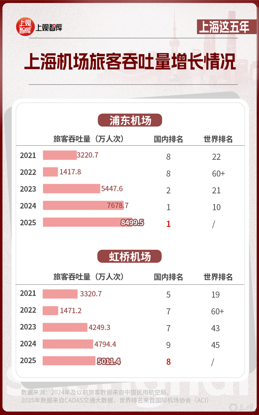 2024年,上海浦東國(guó)際機(jī)場(chǎng)首次排名全國(guó)旅客吞吐量第一,榮登中國(guó)最繁忙的機(jī)場(chǎng)。也是在這一年,上海港成為全球首個(gè)年吞吐量超過5000萬標(biāo)準(zhǔn)箱的世界大港。