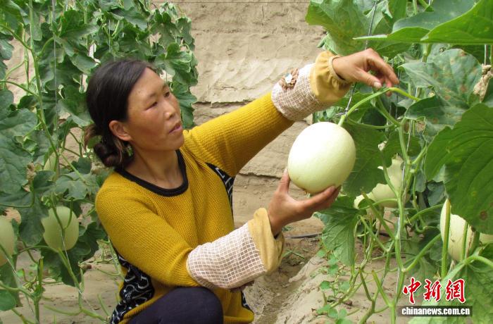 2月初,甘肅省武威市民勤縣種植戶查看玉菇甜瓜長(zhǎng)勢(shì)。馬愛彬 攝