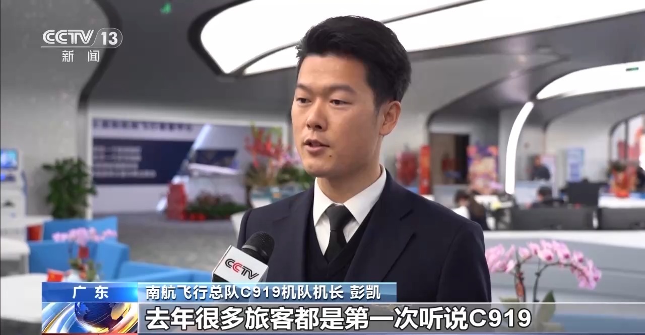 南航飛行總隊(duì)C919機(jī)隊(duì)機(jī)長(zhǎng) 彭凱:去年很多旅客都是第一次聽說C919,今年可能有些不一樣,很多旅客已經(jīng)主動(dòng)選乘去拍照打卡這個(gè)機(jī)型了。