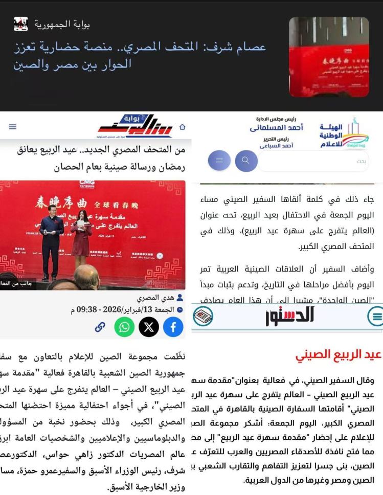 沙拉夫表示,本次活動(dòng)選擇在大埃及博物館舉辦,具有十分重要的意義,這是埃中兩大古老文明相知相交、交融共生的生動(dòng)見證。春節(jié)既承載著萬象更新的美好希冀,也開啟了辛勤耕耘的嶄新周期,蘊(yùn)含著人與自然和諧共生、尊重時(shí)序節(jié)律的中國哲學(xué)。2026年是馬年,在中國文化中,馬寓意著力量、進(jìn)取、活力,更象征著自信奔赴未來的精神。這種精神內(nèi)涵與當(dāng)前埃中關(guān)系蓬勃發(fā)展的良好態(tài)勢(shì)高度契合。愿兩國攜手并進(jìn),邁向更加光明的未來。