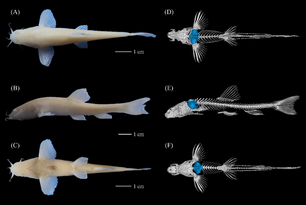 這是“納雍盲高原鰍”的外形及骨骼對比圖,研究人員從背面、側面以及腹面對這一新種的外形和內部骨骼進行了對比。(受訪者供圖)