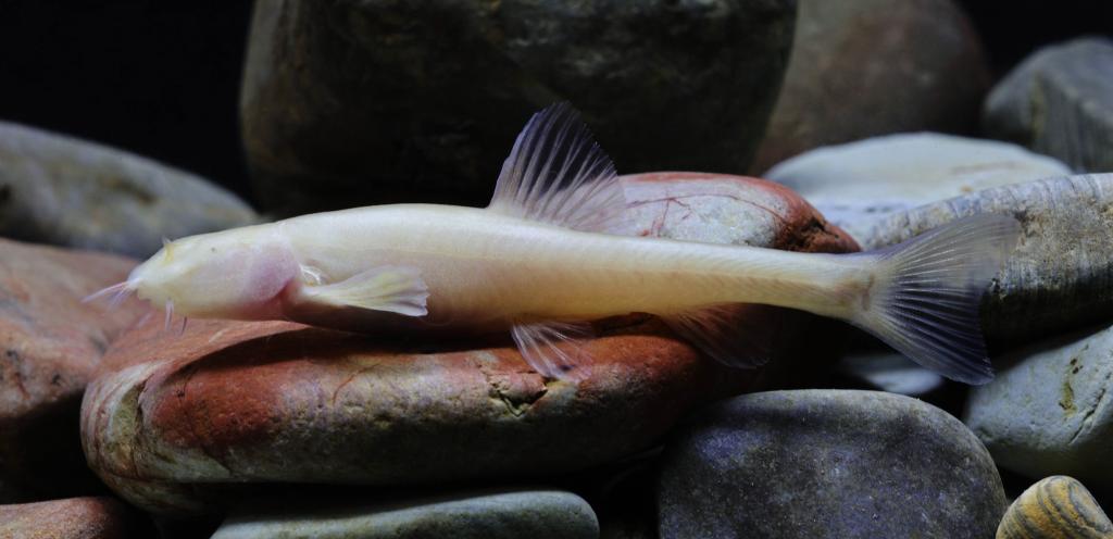這是“納雍盲高原鰍”的活體圖,其身體呈現(xiàn)透明淡粉色,鱗片消失,眼睛退化為小黑點。(受訪者供圖)