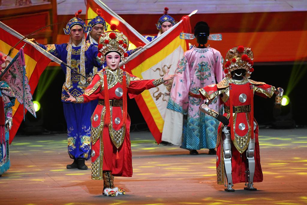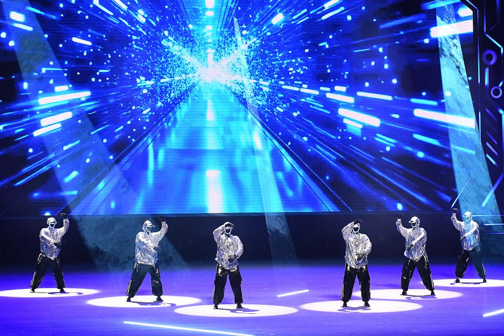 在開(kāi)場(chǎng)節(jié)目《萬(wàn)馬奔騰》中,20臺(tái)機(jī)械臂與26臺(tái)雙臂機(jī)器人齊揮鼓槌,激昂鼓聲奏出奮進(jìn)節(jié)拍。