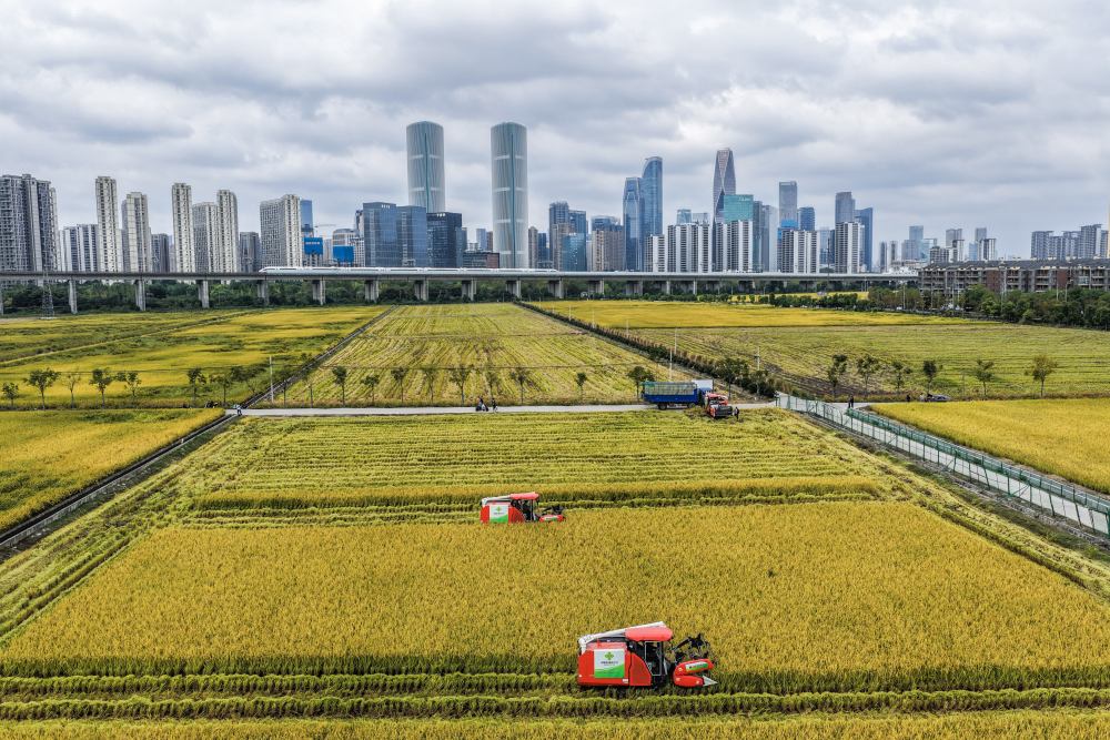 2025年10月21日,在浙江杭州蕭山區(qū),收割機在稻田里收割水稻,遠處高鐵列車飛馳而過(無人機照片)。新華社記者 徐昱 攝