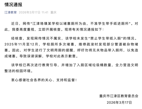 經(jīng)核查,發(fā)現(xiàn)網(wǎng)傳情況不屬實(shí),該學(xué)校未發(fā)生“禁止學(xué)生帶紙入廁”的情況。2025年11月至12月,學(xué)校廁所多次堵塞,維修疏時(shí)發(fā)現(xiàn)部分管道被雜物堵塞。因此,對(duì)學(xué)生進(jìn)行了文明用廁的提醒,呼吁勿將無(wú)關(guān)物品帶入廁所,以免造成堵塞。導(dǎo)致誤讀誤解,學(xué)校對(duì)此表示歉意。