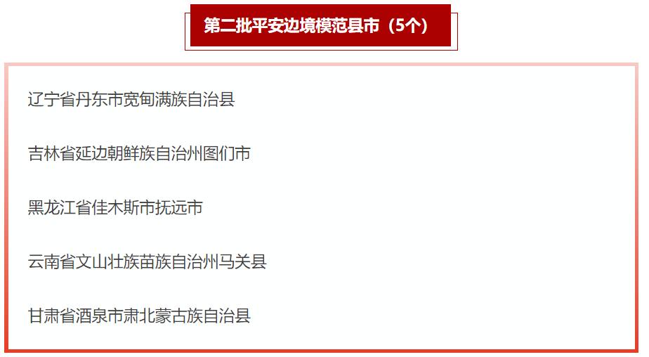 5個(gè)第二批平安邊境模范縣市名單。(國(guó)家移民管理局微信公眾號(hào)截圖)