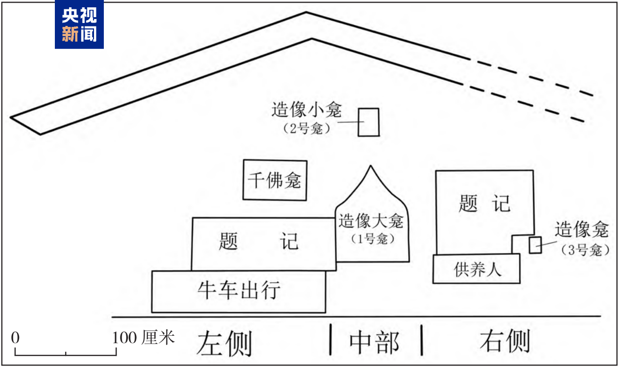 摩崖造像位于崖壁中部,正中為造像大龕,千佛龕、發(fā)愿文及供養(yǎng)人題記等圍繞大龕展開。