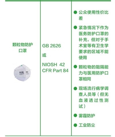 工業(yè)防顆粒物口罩:顆粒物的阻隔能力與醫(yī)用防護口罩類似,可用于工業(yè)防塵和霧霾防護。由于該類口罩無血液透過性測試,不推薦公眾佩戴,也不能用于手術(shù)室等有衛(wèi)生學(xué)要求的區(qū)域。(橫列為口罩的圖片+名稱、產(chǎn)品標(biāo)準(zhǔn)、建議應(yīng)用場景。圖片來源:中國疾控中心)