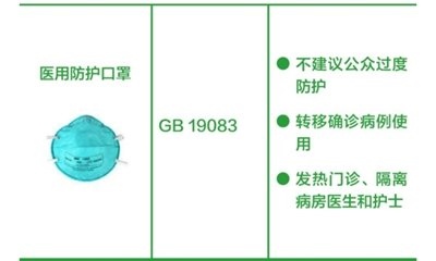 醫(yī)用防護口罩:推薦發(fā)熱門診、隔離病房醫(yī)護人員,以及確診新型冠狀病毒感染患者轉(zhuǎn)移使用。資源缺乏時,不建議公眾過度防護,可留給一線醫(yī)護人員使用。(橫列為口罩的圖片+名稱、產(chǎn)品標(biāo)準(zhǔn)、建議應(yīng)用場景。圖片來源:中國疾控中心)