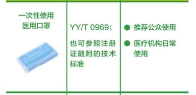 一次性使用醫(yī)用口罩:推薦公眾和醫(yī)療機構(gòu)的日常使用。(橫列為口罩的圖片+名稱、產(chǎn)品標(biāo)準(zhǔn)、建議應(yīng)用場景。圖片來源:中國疾控中心)