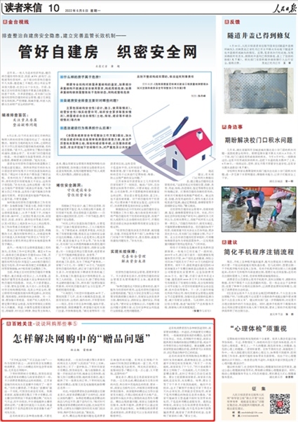 2022年6月6日,《人民日報》讀者來信版“百姓關(guān)注”欄目《怎樣解決網(wǎng)購中的“贈品問題”》一文則關(guān)注了“人民投訴”平臺用戶“下單時頁面顯示有贈品卻未收到,客服回應(yīng)是贈品有限、隨機抽取買家”等線上商家的失信行為。