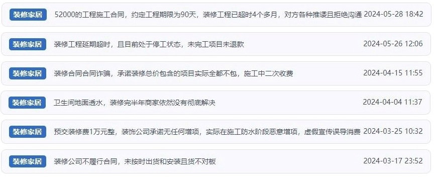 其實,有著同樣遭遇的消費(fèi)者不在少數(shù)。公開報道顯示,今年以來有多個家裝機(jī)構(gòu)分公司或經(jīng)銷商跑路,還有個別不良裝修公司在短時間內(nèi)聚收大量預(yù)付款后攜款跑路,給消費(fèi)者帶來經(jīng)濟(jì)財產(chǎn)損失。“人民投訴”梳理發(fā)現(xiàn),除閉店跑路外,目前平臺上涉及家裝消費(fèi)類的投訴問題多聚焦于——