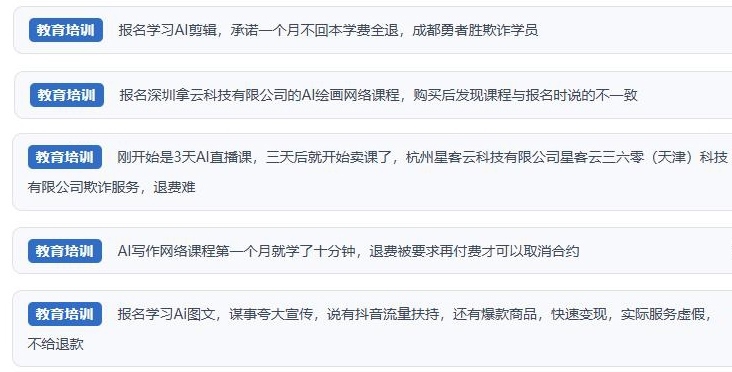 然而,“人民投訴”經(jīng)梳理發(fā)現(xiàn),網(wǎng)絡(luò)上不少消費(fèi)者吐槽相關(guān)課程質(zhì)量良莠不齊,與廣告承諾“免費(fèi)領(lǐng)取AI應(yīng)用體驗(yàn)課及AI工具”“低投入、高回報”“副業(yè)賺錢”“快速變現(xiàn)”等內(nèi)容大相徑庭。相關(guān)商家虛假宣傳、誘導(dǎo)消費(fèi)、貨不對板以及退費(fèi)難等問題被反復(fù)提及。