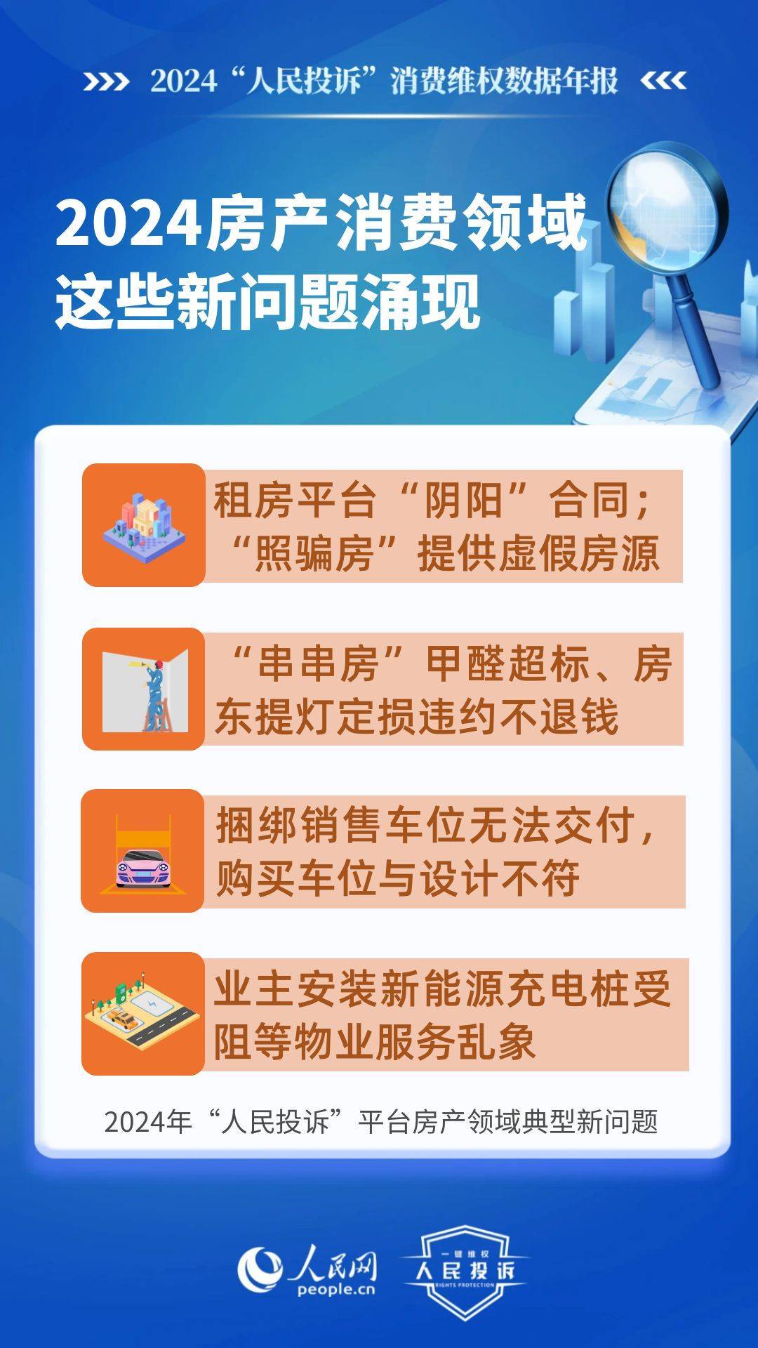 新問題體現(xiàn)在:租房平臺(tái)“陰陽”合同、提供虛假房源、甲醛超標(biāo)不退款、違約不退定金/押金等;捆綁銷售車位無法交付,購買車位與設(shè)計(jì)不符,人防車位/不合格機(jī)械車位當(dāng)普通車位賣,無法正常使用,業(yè)主安裝充電樁受阻等。