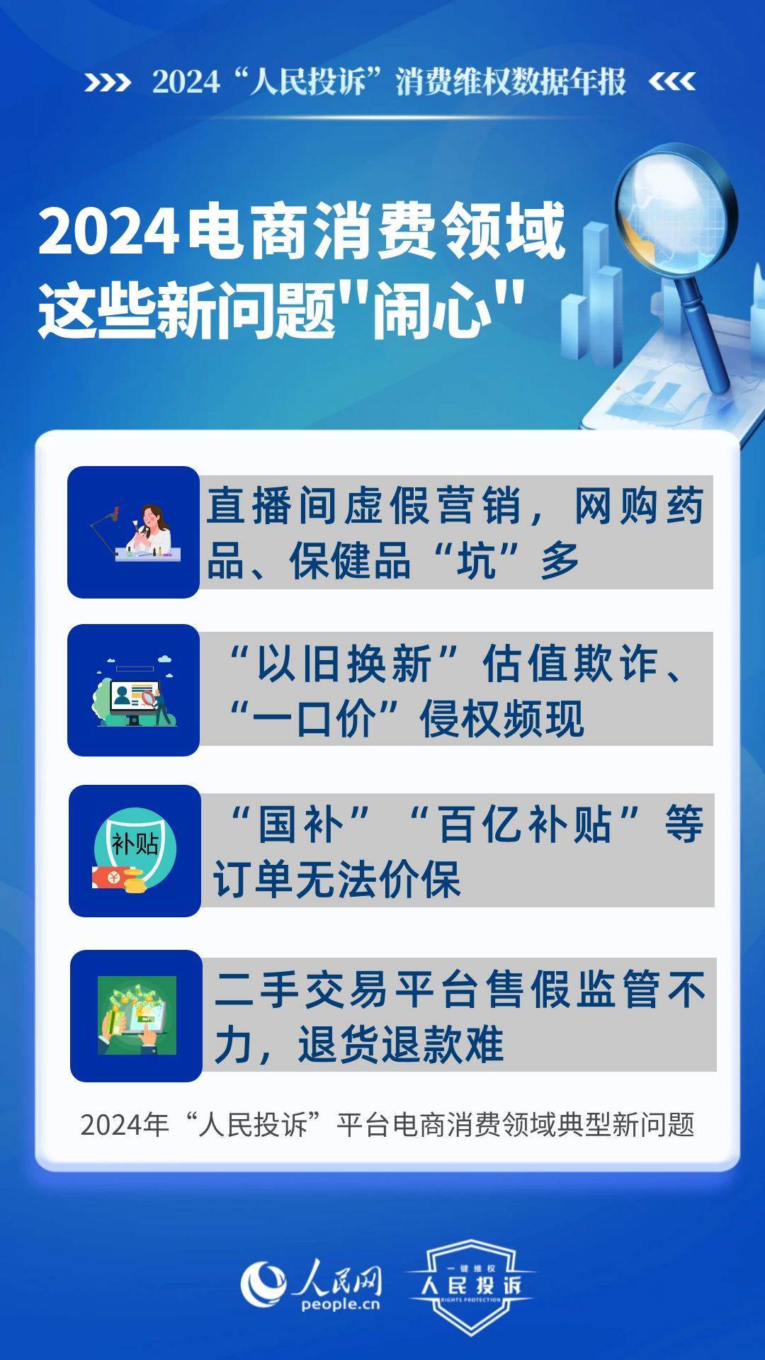 新問題體現(xiàn)在:直播間虛假營(yíng)銷,購買玉石/網(wǎng)課/旅游產(chǎn)品等消費(fèi)“踩雷”多;“以舊換新”估值欺詐、“一口價(jià)”侵權(quán)頻現(xiàn);“國(guó)補(bǔ)”“百億補(bǔ)貼”訂單不給價(jià)保;二手交易平臺(tái)對(duì)商家售假監(jiān)管不力、“陰陽”檢測(cè)、退貨退款難;網(wǎng)購藥品/保健品/醫(yī)療器械“坑”多等。