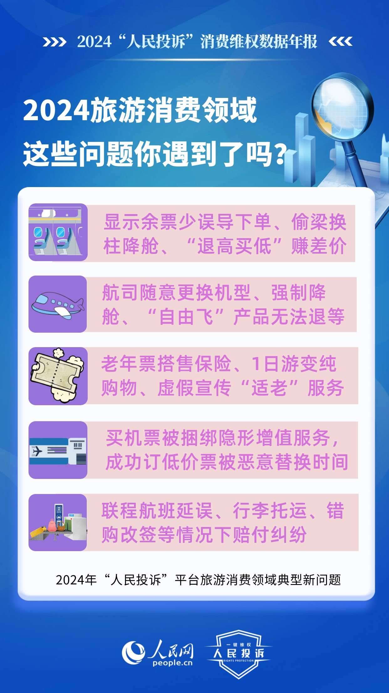 2024年,旅游消費(fèi)持續(xù)火爆,以舊換新“換”出消費(fèi)新活力,直播電商“品質(zhì)化”轉(zhuǎn)型,新能源汽車購銷兩旺……在消費(fèi)市場(chǎng)熱力持續(xù)提升的背景下,旅游產(chǎn)品退訂難,電商促銷虛假價(jià)保,直播間營(yíng)銷違規(guī),車險(xiǎn)車貸服務(wù)欺詐,AI培訓(xùn)貨不對(duì)板等消費(fèi)侵權(quán)問題引發(fā)廣泛關(guān)注。“人民投訴”發(fā)布年報(bào)帶您回顧這一年來,平臺(tái)消費(fèi)維權(quán)熱點(diǎn)和入駐企業(yè)積極處理糾紛的舉措。