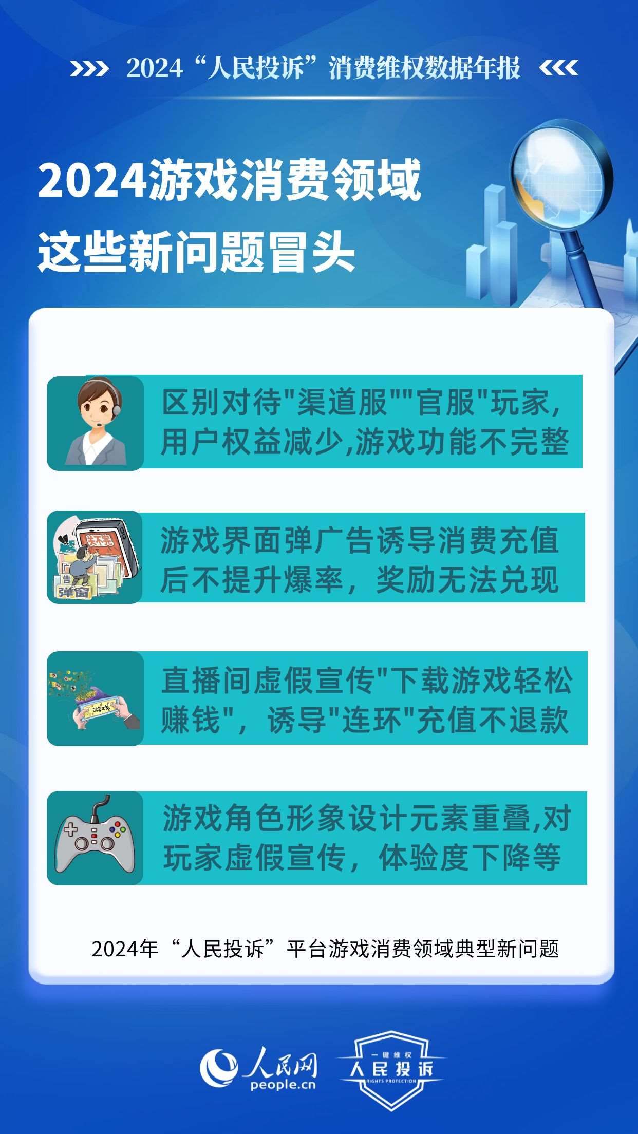 在游戲類,老問題主要有:未成年人網(wǎng)游消費(fèi)不規(guī)范,平臺(tái)以“免費(fèi)”“紅包”誘導(dǎo)點(diǎn)擊充值,未身份驗(yàn)證、支付環(huán)節(jié)無提示,提交證據(jù)申請(qǐng)退款遭拒或退款金額不合理;虛假宣傳游戲內(nèi)容誘導(dǎo)充值點(diǎn)券,玩家實(shí)際回報(bào)/游戲體驗(yàn)與預(yù)期不符;無故封號(hào)、游戲裝備丟失、賬號(hào)被盜、系統(tǒng)漏洞導(dǎo)致玩家利益受損,客服不回應(yīng)、平臺(tái)不理;系統(tǒng)漏洞、卡頓閃退、匹配機(jī)制失衡等網(wǎng)游體驗(yàn)差等。