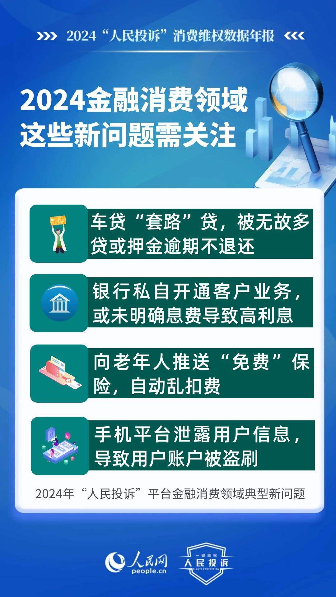 新問題體現(xiàn)在:車貸“套路”貸,被無故多貸或押金逾期不退還;銀行私自開通客戶銀行卡業(yè)務(wù),或未向客戶明確息費(fèi)導(dǎo)致高額利息;小程序誘導(dǎo)充值后提現(xiàn)欺詐;支付平臺(tái)向老年人推送“免費(fèi)”保險(xiǎn),自動(dòng)亂扣費(fèi);手機(jī)平臺(tái)泄露用戶信息,導(dǎo)致用戶賬戶被盜刷、微信錢包被自動(dòng)扣款等;跨境電商運(yùn)營(yíng)App誘導(dǎo)高額充值后無法提現(xiàn)、不退款等。