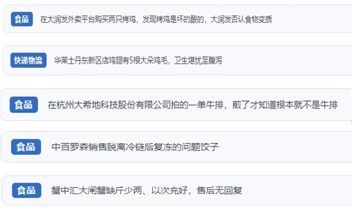 “人民投訴”上不少網(wǎng)友反映,“外賣(mài)商家銷(xiāo)售排骨套餐中含過(guò)期飲料”“外賣(mài)店鋪吃出蟑螂,商家不按照食品安全法賠償” “直播間購(gòu)買(mǎi)車(chē)?yán)遄樱摷傩麄?J、原裝進(jìn)口,到貨嚴(yán)重貨不對(duì)板”“網(wǎng)購(gòu)東北珍珠貢米,到貨包裝上執(zhí)行標(biāo)準(zhǔn)是廢止的標(biāo)準(zhǔn)”“超市買(mǎi)的梅花肉切開(kāi)發(fā)現(xiàn)是淋巴肉”“平臺(tái)商家承諾枸杞不熏硫酸,實(shí)則檢測(cè)后含硫超標(biāo)”“知名便利店售賣(mài)脫離冷鏈后多次復(fù)凍的餃子”等。