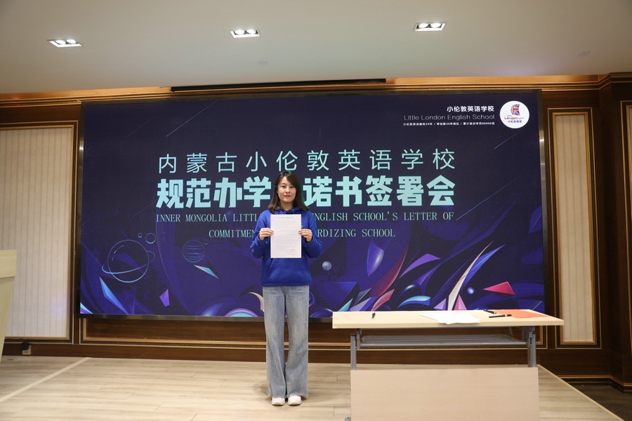 “堅(jiān)持黨的領(lǐng)導(dǎo),堅(jiān)持社會(huì)主義辦學(xué)方向,持證辦學(xué),依法辦學(xué)。以興趣培養(yǎng)為目標(biāo),推動(dòng)國(guó)際化人才的培養(yǎng)。堅(jiān)決推進(jìn)“減負(fù)”,不擅自提升學(xué)費(fèi),不在法定節(jié)假日安排授課。招生宣傳真實(shí)可信,杜絕夸大宣傳、虛假承諾、捆綁誘導(dǎo)、隱瞞欺詐等方式誤導(dǎo)學(xué)生及家長(zhǎng)的行為……”簽署會(huì)現(xiàn)場(chǎng),內(nèi)蒙古小倫敦英語(yǔ)學(xué)校副校長(zhǎng)尚燕云宣讀《內(nèi)蒙古小倫敦英語(yǔ)學(xué)校規(guī)范辦學(xué)承諾書(shū)》。