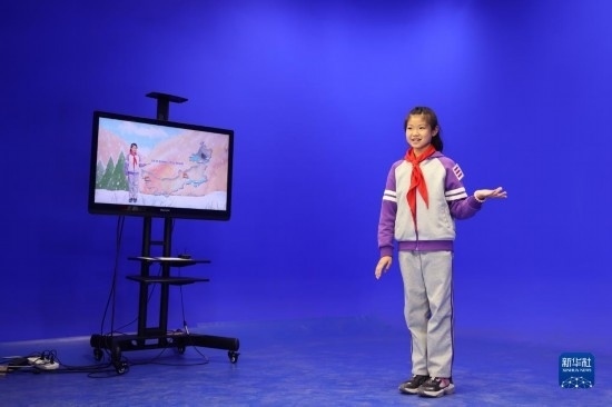 3月23日,一名學(xué)生在內(nèi)蒙古自治區(qū)氣象局天氣預(yù)報演播室內(nèi)體驗演播過程。