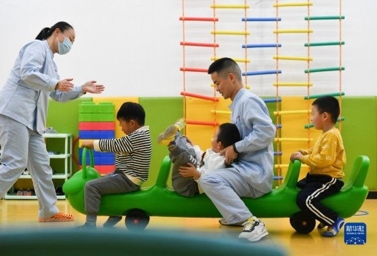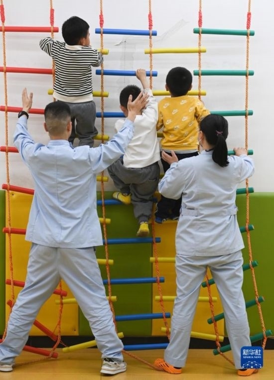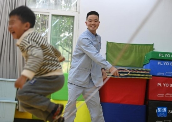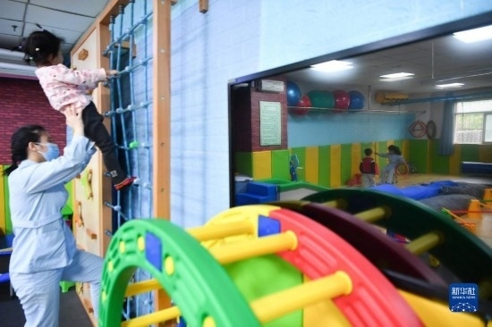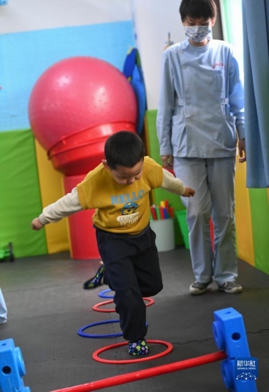 3月30日,在西安市金色陽光康復(fù)中心,孩子們在特教老師的保護下進行康復(fù)訓(xùn)練。