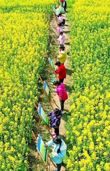 江蘇如皋市下原鎮(zhèn)下原幼兒園小朋友在油菜花田間畫(huà)畫(huà)。徐慧攝/光明圖片