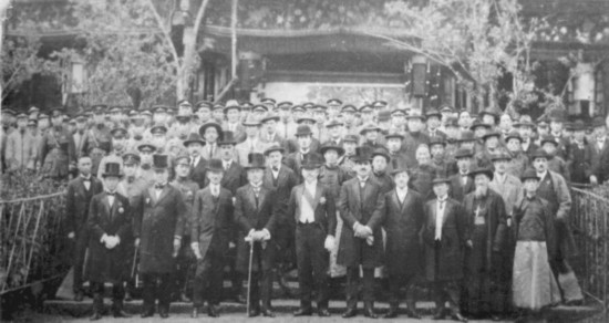 1923年4月20日,東陸大學(xué)隆重舉行新校舍奠基典禮暨大學(xué)開(kāi)學(xué)典禮。奠基儀式后,唐繼堯(左5)、董澤(左1)與英、美、法、日等國(guó)領(lǐng)事、河內(nèi)大學(xué)代表、省議會(huì)議長(zhǎng)、航空處處長(zhǎng)等政府官員合影。云南大學(xué)供圖
