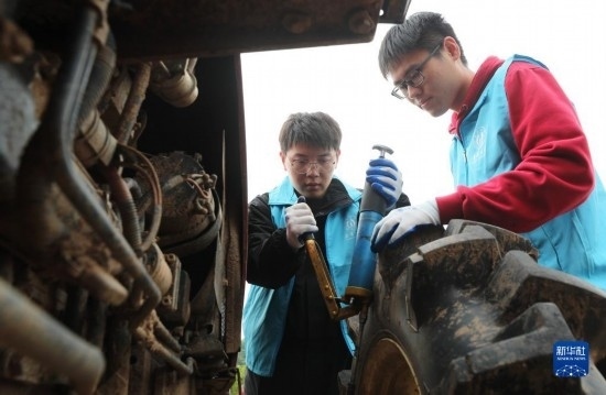 4月29日,在衡陽縣西渡鎮(zhèn)新橋村,南華大學的大學生志愿者在檢修農(nóng)機。
