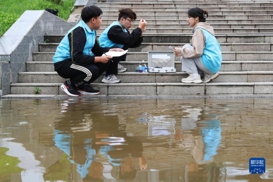 4月29日,在衡陽縣西渡鎮(zhèn)新橋村,南華大學的大學生志愿者在檢測水質(zhì)。