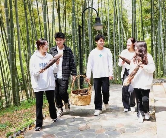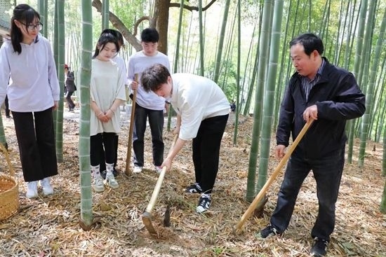 進(jìn)行40分鐘的“漫談式”課程后,師生們一起拿起鋤頭,開始挖筍實(shí)踐。在勞動(dòng)中,他們感受著春天的饋贈(zèng)。該校視覺傳達(dá)與設(shè)計(jì)專業(yè)的南通姑娘周雨濛從未嘗試過挖筍。對于校園中的竹子是何人養(yǎng)護(hù)、怎么養(yǎng)護(hù),她了解得不多。課堂上,她第一次拿起鋤頭,在學(xué)校校工的帶領(lǐng)下挖筍。