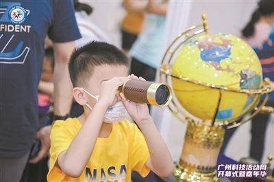 小學(xué)生使用望遠(yuǎn)鏡觀察物體。廣州科技活動周主辦方供圖