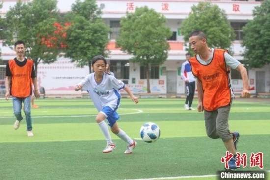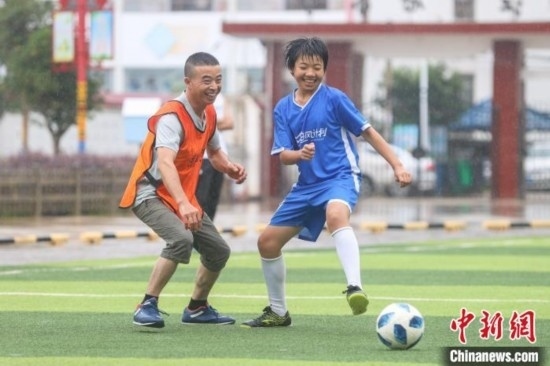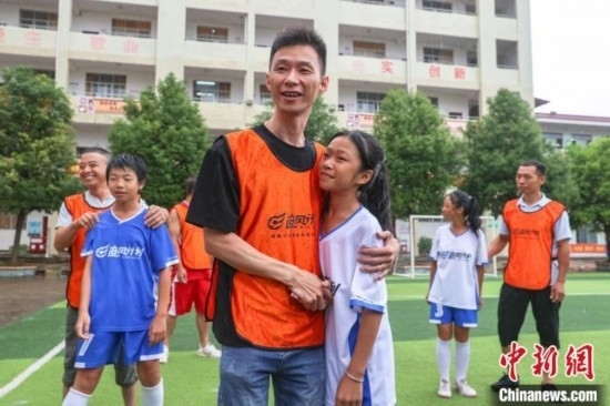 “今天第一次和爸爸踢球,我特別高興和感動(dòng)。他踢得很好,還帶球過了我?guī)状?。我希望爸爸以后能多陪我踢球?!?4日,在江西贛州尋烏縣澄江中心校的足球場上,來自該校晨曦女子足球隊(duì)的隊(duì)員廖怡菱和其他四位隊(duì)員在父親節(jié)前夕,驚喜地見到了自己身在外地工作的父親,并第一次和父親一起踢球,進(jìn)行了一場特別的親子足球賽。