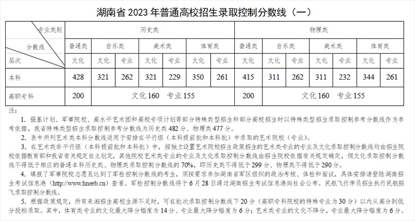 人民網(wǎng)北京6月25日電 據(jù)湖南省教育考試院消息,今天,湖南省2023年普通高校招生各批次錄取控制分?jǐn)?shù)線公布,本科普通類中,歷史類428分、物理類415分;特殊類型招生錄取控制參考分?jǐn)?shù)線中,歷史類482分、物理類477分。(李依環(huán)、實(shí)習(xí)生張婉柔)