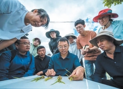 科技創(chuàng)新中國工程院院士張福鎖(中)和科技小院學生、農(nóng)民一起探討中稻種植技術(shù)。趙 渝攝(人民視覺)