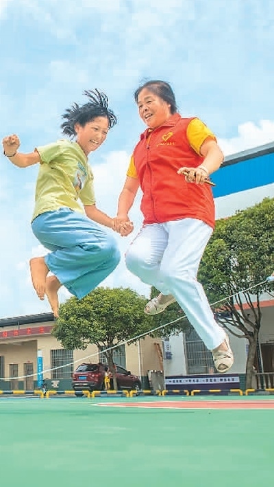 圖為8月1日,在道縣仙子腳鎮(zhèn)黃田崗村,孩子們和志愿者一起跳繩。