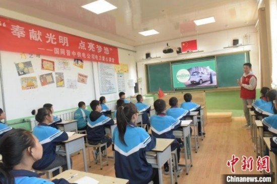 在國家電網“電力愛心教室”內,電力人員為鄉(xiāng)村兒童科普電力知識。展望攝