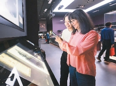 兩位觀眾在中國考古博物館內(nèi)的“甲骨互動(dòng)體驗(yàn)區(qū)”參與體驗(yàn)活動(dòng)。新華社記者 李 賀攝
