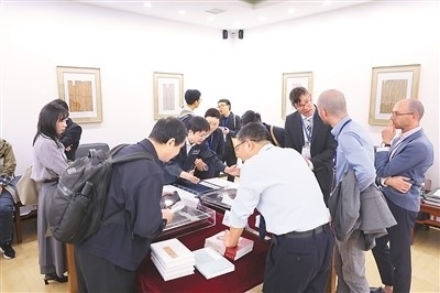 參加“古文字與中華文明”國際學(xué)術(shù)論壇的專家學(xué)者在參觀清華簡(jiǎn)。