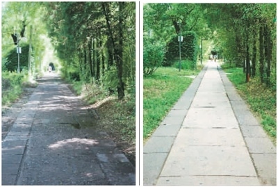 左圖:保護項目對燕南園水泥路修復前的景象。右圖:保護項目對燕南園水泥路進行修復后的效果。燕南園保存下來的水泥路以“脫漿彩石混凝土”工藝進行施工,老校友稱之為“洋灰路”。這里的“洋灰路”已有76年歷史,大部分仍能正常使用。北大建筑與景觀設(shè)計學院的李迪華老師發(fā)現(xiàn),燕南園東側(cè)水泥路破損后,顯露出大小和顏色都參差不齊的石子。于是,他開始追溯這些“洋灰路”的歷史價值,與北大“燕園公益營建社”的黃可同學翻閱北大檔案館資料,找到了歷史照片。又幾經(jīng)輾轉(zhuǎn),尋訪到了九旬高齡的老校友。研究發(fā)現(xiàn),燕園中最早的水泥路修建于1948年。為此,李迪華大力呼吁保護這些水泥路,尋訪到專門修復歷史路面的施工團隊,對少量保存完整的路面進行修復;破損的洋灰原料則被回收,取出原骨料,采用相同的工藝進行還原。不僅老材料得到循環(huán)利用,歷史道路的價值也“凝固”在更新后的路面中。
