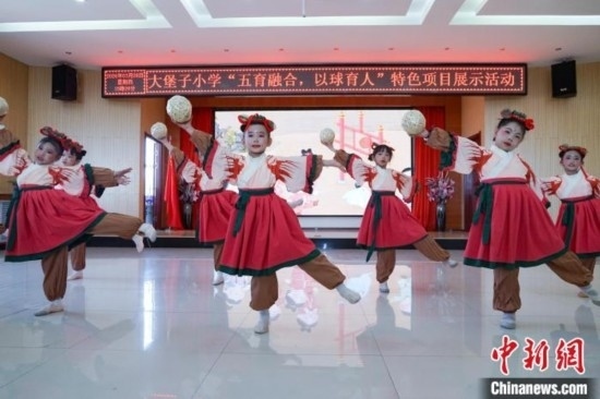 圖為在西寧市大堡子小學(xué),學(xué)生展示“蹴鞠”舞蹈。馬銘言 攝