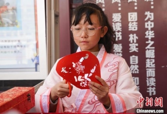 圖為在西寧市大堡子小學(xué),學(xué)生正在裁剪融入足球文化的剪紙作品。馬銘言 攝