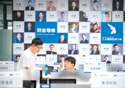 圖為師生在眾創(chuàng)空間開放工位上交流。