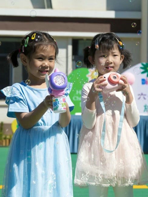 當(dāng)日,打扮成迪士尼童話里人物的老師們與盛裝打扮的小朋友們,共同手持泡泡機,在晶瑩剔透的泡泡里一起沉浸在童話世界里。