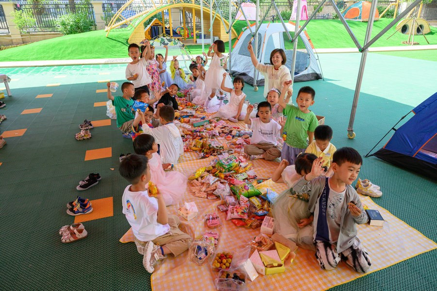當(dāng)日,在幼兒園的操場(chǎng)上,五顏六色的野餐墊鋪,可愛(ài)俏皮的帳篷,精致的裝飾,數(shù)不勝數(shù)的水果點(diǎn)心,小朋友們?cè)陉帥鎏幈M情享受著美味,與老師們一起享受著夏日里野餐派對(duì)的美好。