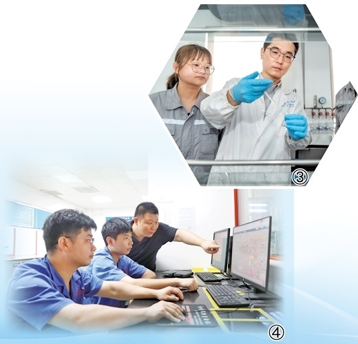 圖①:東港熱電公司博士創(chuàng)新站博士(左)與企業(yè)員工討論實驗反應(yīng)結(jié)果。圖②:東港熱電公司員工(右)帶領(lǐng)參與博士創(chuàng)新站實踐工作的大學(xué)生檢修設(shè)備。