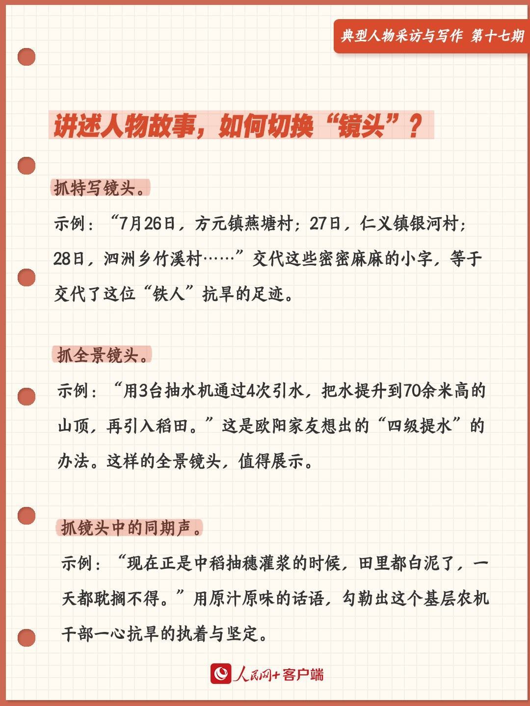歐陽家友家中的日歷,其實就是他的抗旱工作表?!?月26日,方元鎮(zhèn)燕塘村;27日,仁義鎮(zhèn)銀河村;28日,泗洲鄉(xiāng)竹溪村……”交代這些密密麻麻的小字,等于交代了這位“鐵人”抗旱的足跡。這樣的特寫鏡頭,不應(yīng)錯過。