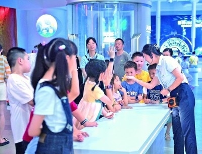 暑期,安徽省科技館在常設(shè)展覽之外開展研學營、科學課程、科學實驗等科普活動,讓孩子們在豐富多彩的活動中感受科技魅力。圖為7月10日,工作人員與參加研學營的小朋友互動。(新華社記者 傅天攝)