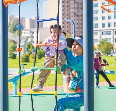 內(nèi)蒙古呼和浩特萬和體育公園,家長幫助孩子攀爬軟梯。丁根厚攝(影像中國)